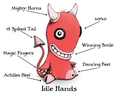 In Yipe! 5, Idle Hands appears as your arch-nemisis. Idle Hands is clever, powerful, and charming ... it will take all your skill to defeat him! Idle Hands is the creation of Dylan Sisson and has the dubious notoriety of being the first urban vinyl toy to appear as a special guest in a video game. Read more about Idle Hands at www.creepy-cute.com